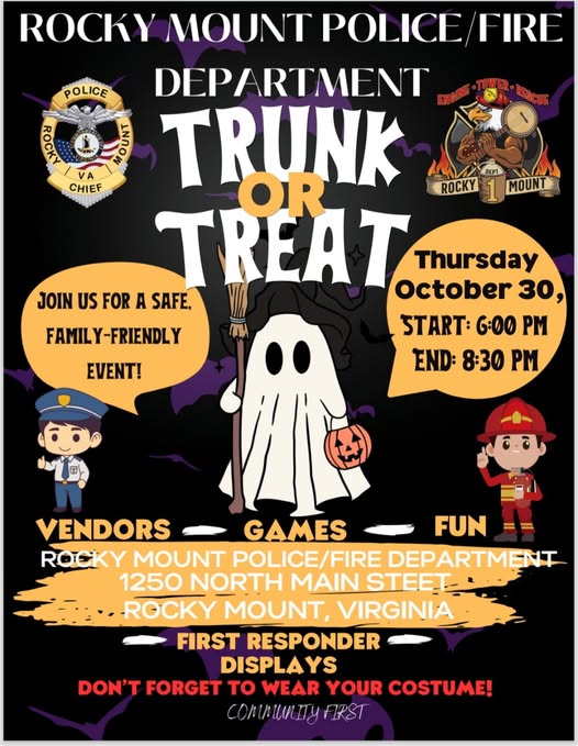 Join the Rocky Mount Police Department and the Rocky Mount Fire Department for our annual Trunk or Treat! This family-friendly event is a safe and fun way to celebrate Halloween with the community.