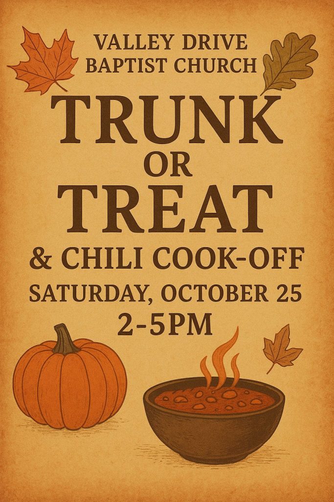 Join us at Valley Drive Baptist Church for our Trunk or Treat & Annual Chili Cook-Off on Saturday, October 25th, from 2–5 PM.