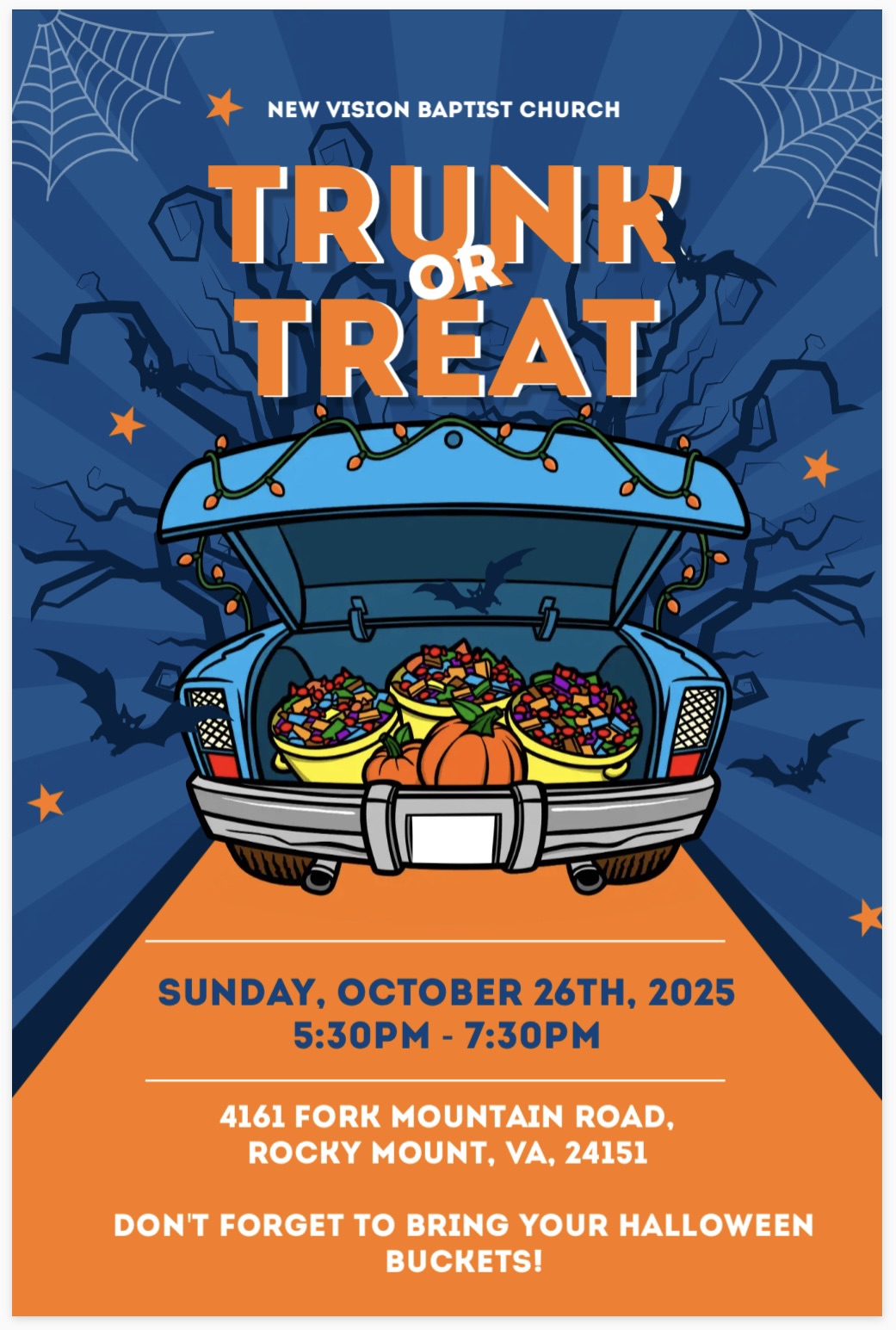 Join us for our Trunk-or-Treat on Sunday, October 26th, 2025, from 5:30–7:30 PM!