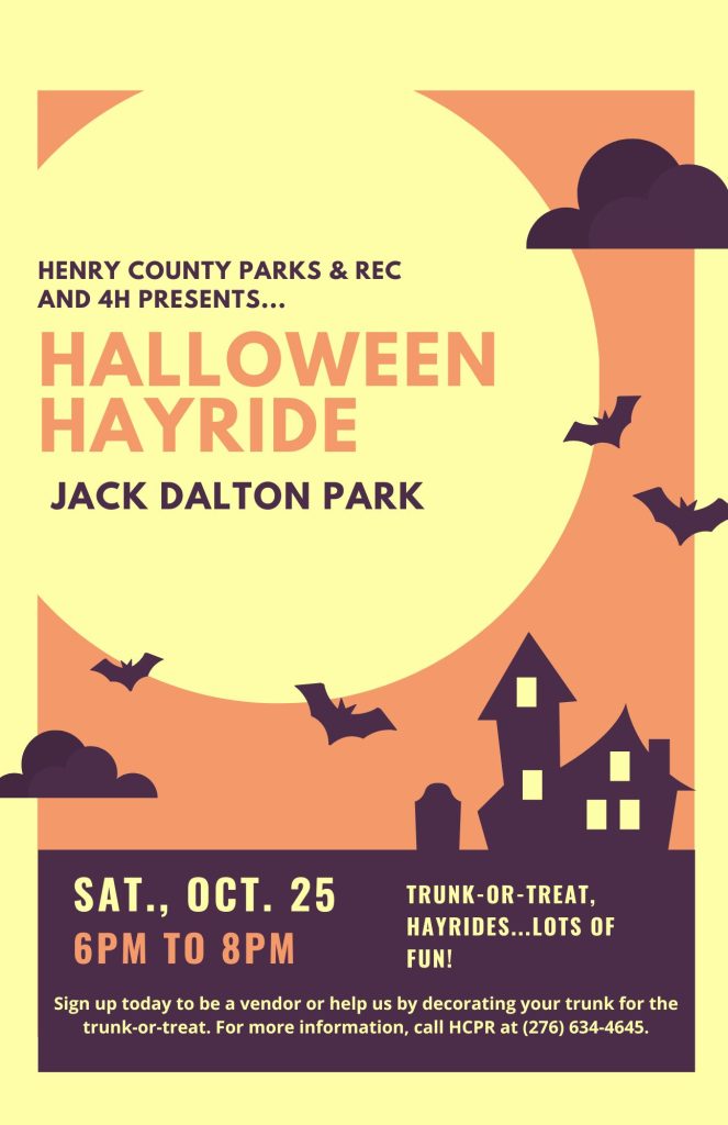 Join us at Jack Dalton Park for a fun hayride around the park! Thanks to the Martinsville/Henry County 4H, the hayride will become spookier as the evening progresses. We will also have trunk-or-treating in the parking lot. If you’re interested in being a vendor or decorating your trunk to pass out candy, please call Daniel at 276-634-4645. Pre-registration is NOT required to attend the event.